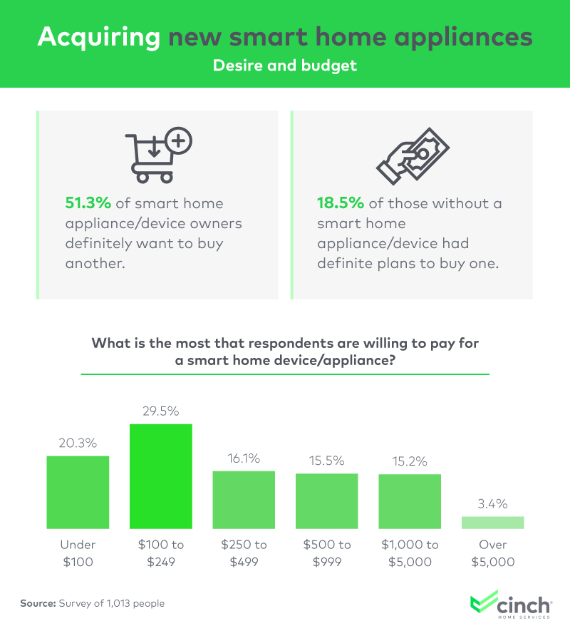 And just how much are they willing to pay? Thirty percent of people said they would spend between $100 and $249 for a smart device or appliance, though 16% were willing to spend between $500 and $999, and another 15% were willing to spend between $1,000 and $5,000. While smaller overall, 3% of respondents were willing to pay more than $5,000 to bring smart technology into their homes.